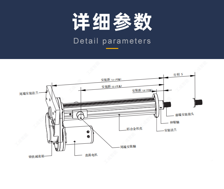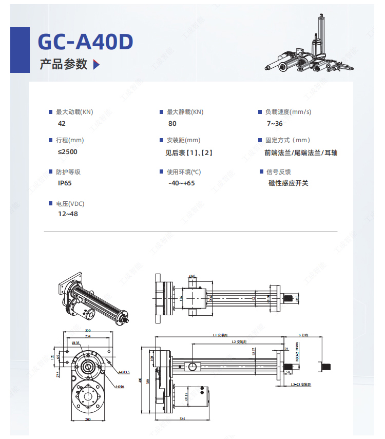 最大动载:42KN;最大静载:80KN; 负载速度: 7~36mm/s, 定制行程: ≤2500mm,