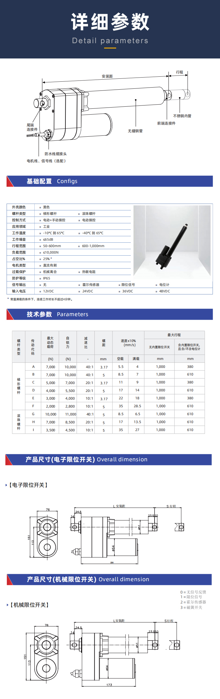 载荷: 1000N, 定制行程: 30-600mm/600-1000mm, 直流有刷电机,
